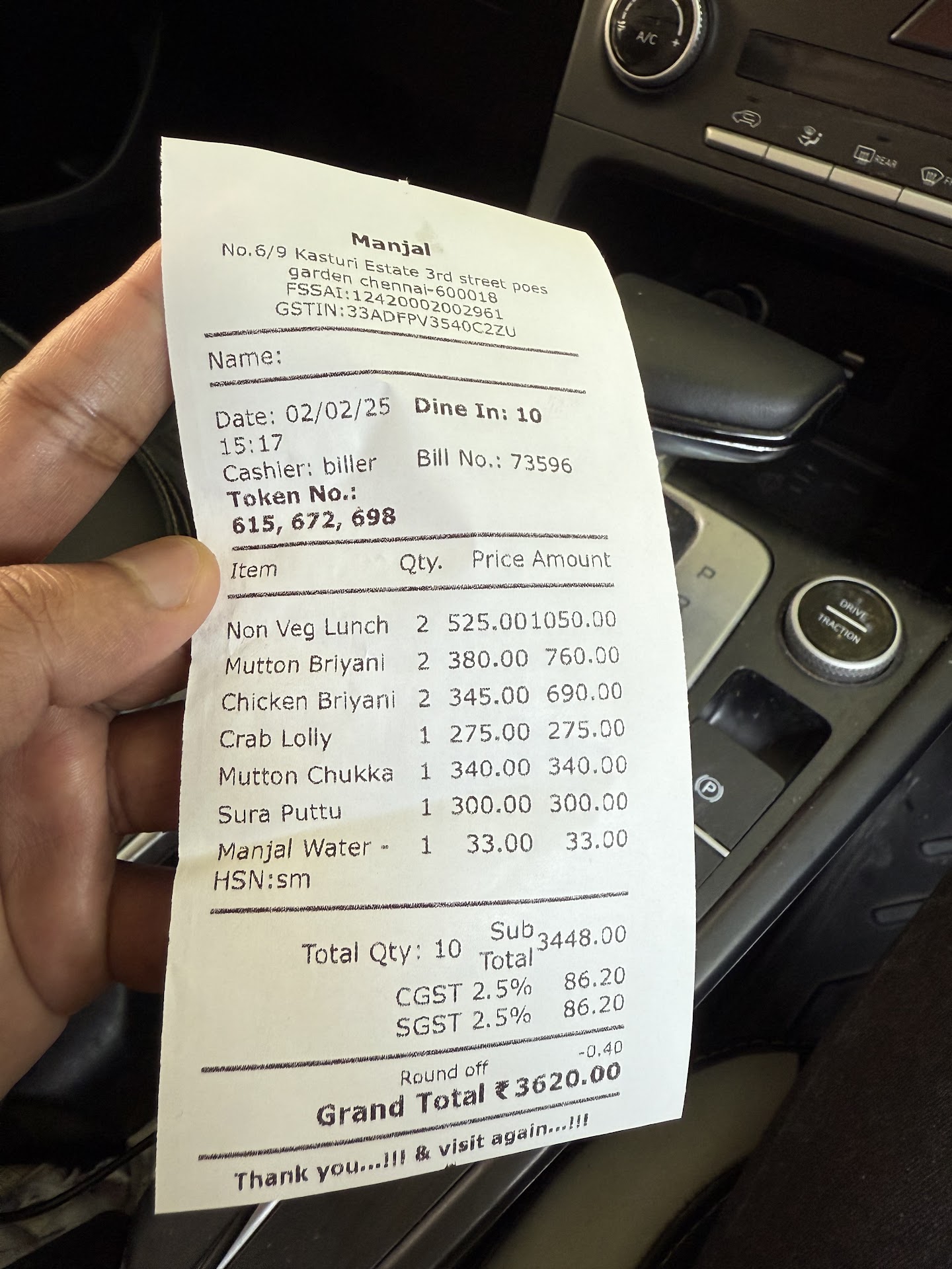 Verdict? I’m not going back. Next time, I’ll head to Sri Kamatchi or anywhere that respects food, service, and the customer’s time — without making it feel like you’re in a race. Tamil Nadu is known for its rich food culture and hospitality. Manjal is the opposite — rushed, uncomfortable, and in my case, unsafe.