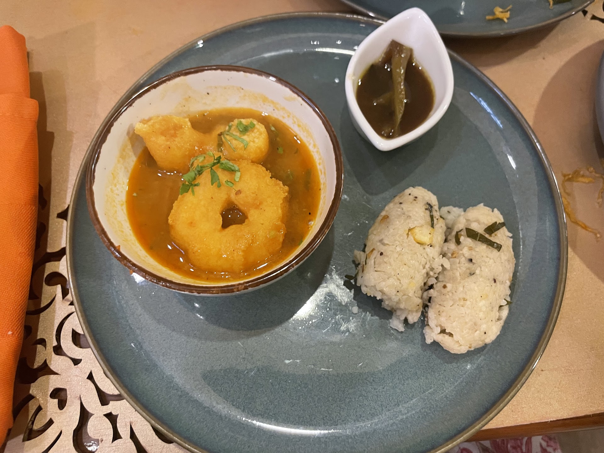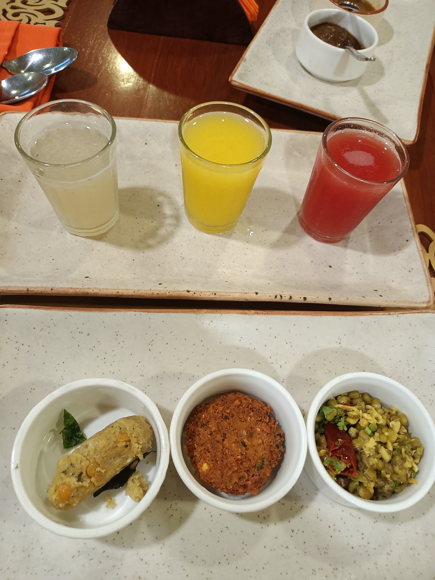 Let me start with the welcome drinks in the poorna option. They give you 3 welcome drinks. I found the paanagam very good and went for s repeat. The starters were good but the chutneys provided for the vada and kozhukattai were lip smacking. There was a Sevai which was soft and good and a dosa which was okay. There was a yummy tomato chutney for the dosai and a ladies finger raitha for the sevai that were outstanding.
