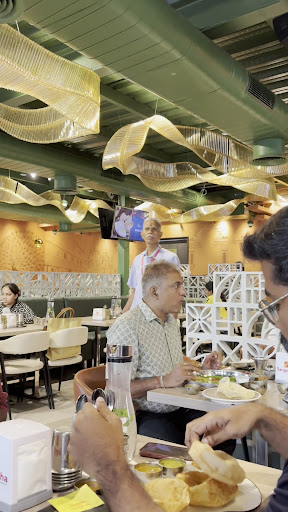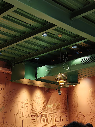 Graphics of Tamilnadu's music and culture adorn the brown walls. A dark green theme with twisting rails on the ceiling has a pleasant effect