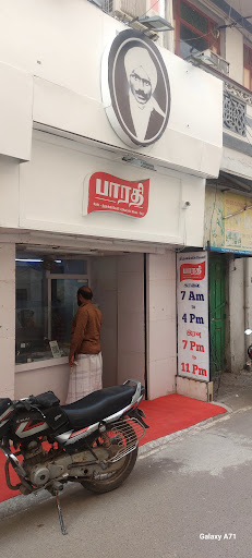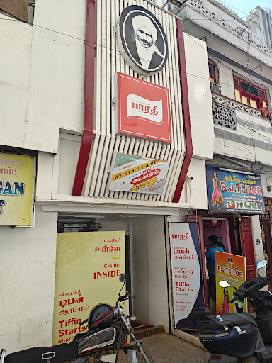 This is situated in Akbar Sahib Street in Triplicane. Opppsite side/rad of Bus stand. Few other branches are also there in other places. I have been to this mess so many times. It is such a quality mess much better than many hotels. Since it is a mess, chairs will not be there to sit and eat. A few years ago, they limited sambar or any side dishes to a cup or so, the quality was so good at those times. No extras at all. But that quantity was enough. When they started to provide extra sambar/other side dishes, the quality came down. Also when they started to provide many varieties too, the quality which was early didn't be there nowadays. Mostly, women work here. Not connected to Bharathiyar anyway, thinks so. But bharathiyar related information will be posted on the walls.