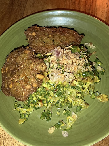 We also ordered a bunch of stuff from the vegetarian menu for the no meat eaters at the table - raw curry, grilled bok choy edamame salad, ooo watermelon gazpacho, more raviolis and Sayur Urup these deep fried long beans mixed vege with shredded coconut croquettes with vegetarian lawar on the side.
