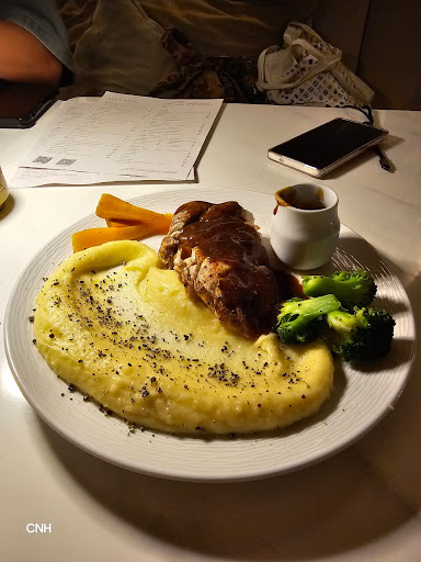 The chicken breast was tender and juicy, served with smooth, buttery mashed potatoes and fresh vegetables. The accompanying sauce complemented the dish perfectly, enhancing its flavor without overpowering the natural taste of the chicken.