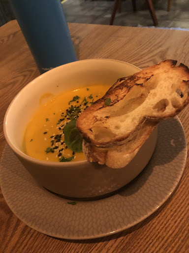 My friend had a falafel bowl. I had their pumpkin chowder, potato mushroom pie, tiramisu and a detox juice. We both enjoyed our food and the ambiance. The pumpkin chowder O M G. My friend tried it and the expression she made, only further solidified that this was a great soup!
