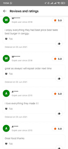 Very below average quality burger, especially the patty. Go-Food reviews are misleading because it's always the same 4 people (owners or staff I would guess) who are giving 5 stars review only ordering an egg, which is 7k. It doesn't make sense for the same 4 people to order just an egg everyday, so my guess is that they are doing it only to be able to build fake reviews that way. I am not the only person who noticed it, see the pictures attached. Of course they will say that it is not true etc, but the pictures are talking more than words.