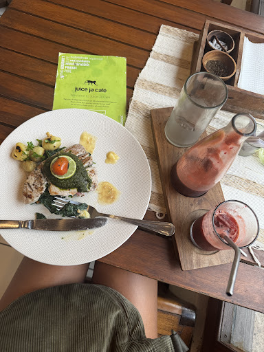 We simply love Juice Ja, and have had a love affair with this cafe and the staff for many years, probably for the past 15 years.. what we love is their consistent quality and service, their food remains fresh, nourishing, great menu options, all day breakfasts and they mean it !! They keep their popular dishes on the menu, so when we return we love the guacamole with corn chips, the chicken or tuna steak with homemade pesto, delicious mini potatos and best cooked spinach we have ever had in Bali. Now they also offer fresh juice for detox or health programmes, they have all the packages, recommendations etc, delivered to your villa or pick up. We also commend them on keeping their pricing affordable compared to other places in Ubud that seem to go up and up in price and out pricing travellers that are here for some time or need to be mindful of budget, families etc. Servings are generous, while still keeping plate design and food presentation high. Ibu Rika and her staff are such awesome hosts and they also have great health food items for purchase, a good range, including local favourite products that we don't seem to find in other cafes or shops. The cafe area is small and quaint has a great feel though, and you can people gaze as they walk along jalan suweta. great location walking distance from jalan raya ubud etc A truly authentic...