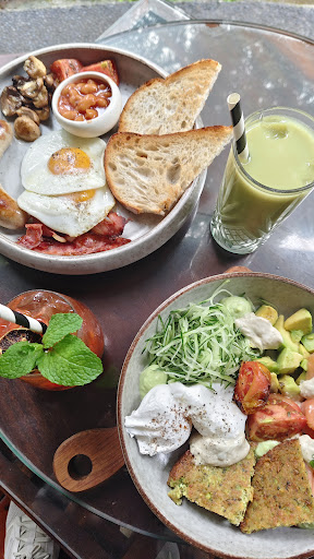 We ordered the salmon breakfast bowl, the English breakfast, iced matcha latte with oat milk, and jasmine muddle mocktail. The salmon was fresh and paired well with avocado, veggies, and falafel. It was my first time trying falafel, and I really liked it. The English breakfast was almost perfect: the bacon, mushrooms, and beans were great, but the sausage was unfortunately spoiled. It had a sour taste, and we noticed that even the flies and the butterflies were more attracted to that plate than the salmon bowl. We let the staff know, and thankfully they responded well.