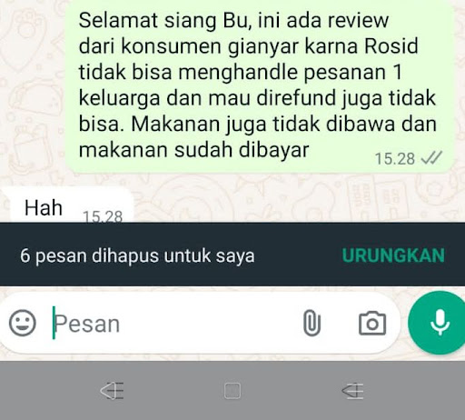 Sebelumnya saya sekeluarga minggu lalu makan di NAU lovina buleleng. Pelayanannya bagus sekali, dan hari ini saya lihat ada kopi NAU di gianyar saya kira akan mendapatkan pengalaman yang sama. Yah ini saya sampe suruh adminnya screenshoot chat ke ownernya langsung biar yg punya usaha ada perenungan kalau mau buat usaha. Kasian kepercayaan pelanggan sama uang dan waktu yg mereka luangkan. Kalau belum mampu bayar karyawan mending jangan buka usaha. masak karyawannya dia sendiri taking order, masak, jadi waiter juga, iya kalau makanannya ada atau saya belum bayar. Yg bikin saya kesal saya mau cancel gak di kasi, dia bilang dah jadi, saya bilang buru buru dia saranin take away trus lagi 2 menu saya mau take away eh malah di kasi 1 saja katanya lagi satu mau dibuatin dulu. Padahal pas saya mau cancel dia bilang sudah jadi. Saya kasi note pas saya masuk cuma ada 1 pelanggan yg sudah dapat makanan jadi sisa keluarga saya saja. Kalau cuma handle 1 meja aja gak mampu...