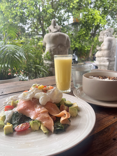 I am surprised about high score. I am in love with most of Canggu cafe, but here so many downsides. The only nice thing is interior. The rest I would improve So many flys. They are so annoying. And they are everywhere. When coming - I was not welcomed, no "hi", no help with menu. was asking for menu myself- then been said scan on table (usually in cafes they point you on that) When I've asked to clean a table - been asked to wait (despite fact there were not a lot of people), cleaned myself in the result In general stuff is slow and not caring about you. Food was not good. Strange healthy breakfast - pesto touch to eggs and sauted spinat was strange Smoothie bowl - little bit of granola and not the best one Mango juice not tasty