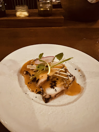 The meal began with a stunningly presented appetizer that set the tone for the night. The soup was a sublime creation; rich and flavorful, it was a delightful way to start the evening. Following that, I was served an exquisite seafood dish adorned with a variety of vibrant condiments, each bringing a unique dimension to the fresh, succulent flavors. Every bite was a true testament to the chef's skill, and the presentation was nothing short of artful.