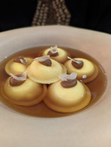 Read moreIn this age of fine dining, gastro-pubs and gastronomic adventures it is quite rare to gasp as you bite into your meal. At Mauri, the gasps, like they do on hit radio, kept on coming. We chose to eat a la carte rather than the tasting menu and yet still ate, what seemed to be, 10 courses. The various amuse bouches were exceptional, especially the cheese mousse with egg foam served in an eggshell, and the mortadella on top of focaccia (probably the best lump of bread I have ever eaten). For mains, the seafood spaghetti was pretty delicious, but the onion ravioli was entirely next level. The pasta was thin, fresh, al dente, delicate and delightful, the onion puree was the perfect balance of onion sweetness and concentrated flavour. Onion dishes usually are overpowered by the onion, which is why I avoid ordering them, but this was perfectly contrasted by an intense, aged parmesan that brought on what should have been my biggest gasp. That exaltation was for the broth. According to the waiter (what impeccable service!) the broth was made from onions but it flooded my mouth with oxtail, beef cheek and fatty abundance. I would have paid just to drink that broth. Combining the broth and the ravioli made me swoon. By this stage we were reeling in a post-climactic lethargy and declined dessert. What we received was another amuse bouche and petit fours that took us closer to heaven than any meal has a right to. The pralines, rectangular prisms of white chocolate encasing a dark chocolate mousse, summed up everything perfectly; we were treated to another surprise, which should have been expected, but no-one makes an after dinner morsel...