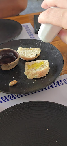 From the moment you step in, you're greeted with the comforting aroma of grilled meats, herbs, and fresh bread. The ambiance is rustic yet elegant, with whitewashed walls, blue accents, and traditional Greek music playing softly in the background.