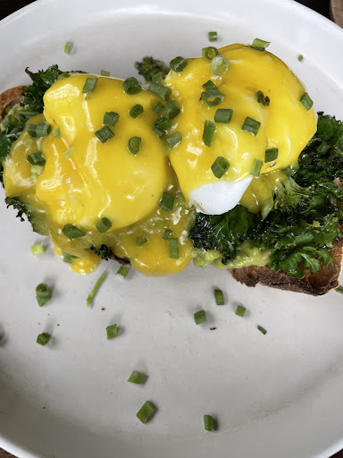 The bread on the Riza Benny was quite hard in parts and I had to remove it before I broke a bracket on my braces. 🫠 The flavor profile of the dish was good and the kale was quite chewy. Be careful I almost choked a couple of times and then again I have braces.