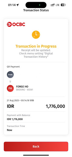 After dinner (wagyu steak and cocktails), we tried to pay the bill: ⢠We usually pay via transfer to BCA (Millie Utama Sakti PT). ⢠This time, OCBC Bank had a system failure: the transfer didnât go through, and QRIS got stuck with the status Transaction in Progress. The money was in the account, the transaction was recorded, but the payment was not confirmed. I was sent with a security guard to withdraw cash from an ATM, while my wife was held in the bar. Three different ATMs were out of service, proving there was indeed a failure in the Indonesian bank OCBC.