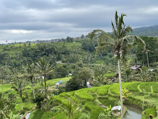quality time with a view of the rice terraces of Jatiluwih, Bali. and the menu of this place starts at 15 thousand! The taste of the food and drink is also good. Oh, I'm so happy. Moreover, this is before the place to pay for the entrance, so it's nice that you don't have to pay if you want to enter this area. Moreover, the building is super majestic dominated by bamboo. It adds to the cool atmosphere of Jatiluwih. The restaurant parking lot is also spacious for motorbikes and cars. That's a cool restaurant. I continued to go upstairs, and wow it's really cool in here. You can immediately see the barista making drinks. Also a beautiful statue of Dewi Saraswati. This spot is suitable for gathering with family or loved ones. You can eat or drink coffee, too. The bottom has bean bags if you want to lie down. I really understand this restaurant for those of us who want a lot. Hehe. There is also a stage if you want to make an event. Also quite a large yard. And, my friends and I chose to sit here. One by one the orders came! We ordered Fried Banana, Ice Cappuccino, Chicken Mushroom, Whole coconut, Seafood Fried Rice, Frozen Strawberry Daiqiri, and Fried Duck. Delicious dishes and cool atmosphere, make me hungry to finish everything. My favorites are Chicken Mushroom and Frozen Strawberry Daiqiri. This is me and my happy friends. We hang out here from noon until late at night. How can you not feel at home, whether it's raining or hot, here you can always radiate beauty.