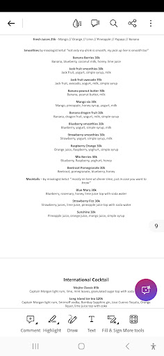 Cocktails Are very descent with a good taste. Like other Balinese bars, they do have some specials, like a list of Arak cocktails (which is a local spirit) or a decent selection of tropical interpretations of classic cocktails (e.g. pineapple mojito) Decent selection good for extending the evening after dinner, but nothing to god for this place explicitly.
