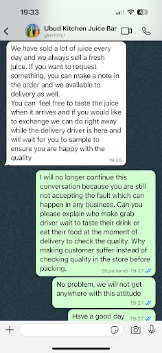 I waited all day for a delivery that never arrived. At 9am, I ordered 2 one-liter bottles of coconut water and 1 bottle of pineapple juice. The Gojek delivering the glass bottles had an accident, and one bottle arrived completely broken. The Gojek drove back to the shop and paid for another bottle with his own money, bringing it to me. However, the content of this replacement bottle was yellowish in color, with an acidic taste and smell. I contacted the shop, and they agreed to replace it, but could not send it directly. They requested that I place another order so they could include the replacement bottle. I reluctantly ordered a small bottle of coconut water, unnecessary for me, just to receive the replacement 1-liter bottle. When the Gojek arrived, they only brought the small bottle I ordered, missing the replacement bottle. I handed over the "bad" 1-liter bottle to the Gojek as instructed, and waited. By 4.30pm, after repeated inquiries and waiting with no explanation, they informed me that I would not receive a replacement. I wasted a day and feel deceived by the unnecessary request to reorder, seemingly just to extract more money from me. Disappointed, I requested to speak with a manager but was not provided any contact information (this is the reason why I am writing here). Tomorrow being Nyepi and the roads currently busy, they had ample time since morning to resolve the issue, having me paid for another delivery, but failing to honor their promise of a...