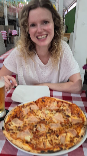 Food: We ordered 1 large Ham Pizza 🍕 as a lunch snack to dine-in. We got it in about 10 min in almost empty restaurant. Visually nothing was off, it looked nice, charred as a proper wood-fire pizza should be. Taste was like a proper Italian pizza - thin, crispy bottom and edge, with nicely melted cheese on top. It was not dry, it was not chevy, it was very good!
