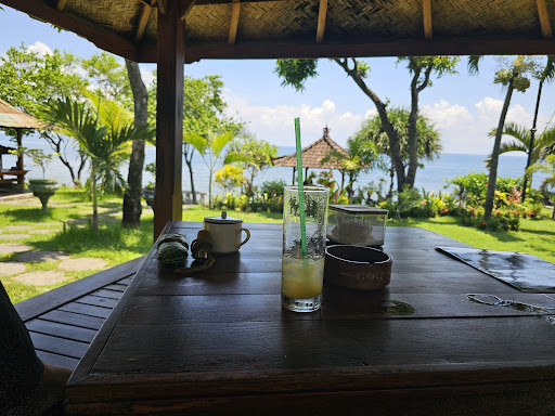 Very beautiful place right on the sea. The menu is Indonesian only so don't expect western course or drinks. The pagodas offer a nice stay with a wonderful view over the ocean (no beach available around here) Be careful with ice-based drinks: according to my belly response, they probably don't use mineral water for ice production. For the rest I think it a...