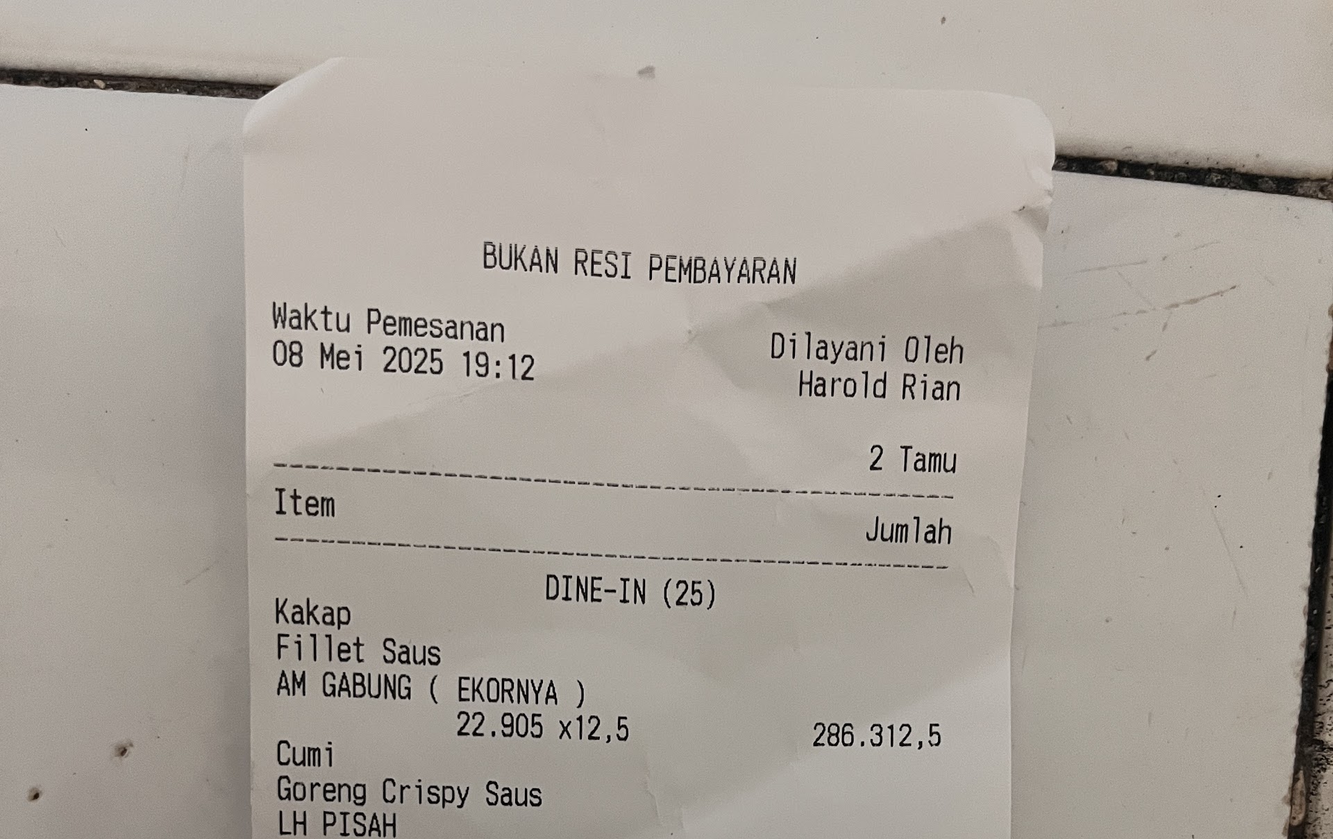 Read moreSANGAT MENGECEWAKAN🙏 kenapa mengecewakan?? Pertama, datang kesana disambut dengan baik. Setelah duduk, pelayan / waiter datang untuk menglist pesanan. Setelah memesan beberapa menu, saya pesan IKAN KAKAP ASAM MANIS. Memang waiternya ini kurang KOMUNIKATIF dalam menjelaskan, seperti ogah2an, gak jelas pokoknya. Bertanyalah saya, “mas bisa dilihat dulu gak ikannya atau pilih ikan” dijawablah “oh iya bisa”. setelah selesai memesan, pergilah saya ke tempat yg bisa pilih ikan. Ternyata ikan kakapnya ukurannya besar2 sedangkan saya hanya berdua. Saya bertanya lagi, “mas bisa dibagi atau dipotong bagian ekornya gak?” dengan jelas Waiter nya jawab “oh bisa” datanglah mas2 yg bagian memotong ikan, Bapak saya sudah mengukur dengan jarinya bagian ekor yg akan dipotong, mas2 pemotong ikan sudah OKE dan mengerti yg kami maksut. Singkat cerita saat MENU IKAN KAKAP ASAM MANIS nya datang. JENG JENGGGG, 2 piring besar??!!!! bingunglah saya kok banyak sekali?. paniklah mereka, lalu ada Waiters mba2 datang dengan memberikan penjelasan yg seolah olah pelanggan yg salah karna memilih 1 ekor ikan. saya tidak mau berdebat disana. akhirnya DI BILL PEMESANAN, HITUNGAN IKANNYA 12 KILO??!! Jelas-jelas kami hanya bilang dipotong bagian ekornya saja. DIBILLING TERTULIS IKAN KAKAP ASAM MANIS EKORNYA (12,5) apa maksutnya 12,5?? sengaja ya gak tulis KILO nya. SUNGGUH MENGECEWAKAN!! Kami hanya pesan bagian ekornya tapi di billingkan 1 EKOR IKAN. Waiter sangat lalai dan saya tidak tahu apakah sengaja dibilingkan begitu sehingga pemesanan tidak sesuai. Seperti ada PERMAINAN BILL, ditulis EKORNYA tapi dihitung SATU EKOR IKAN 12,5. Masak iya bagian ekornya 12,5 kilo???!! gak masuk akal. SAYA LAMPIRKAN STRUKNYA. kecewa! sudah cukup kalau mau kesana lagi mikir...