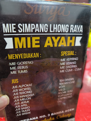 Bicara tentang mie aceh, mungkin wisatawan yang baru pertama datang ke Banda Aceh akan diajak atau tergoda untuk menggoda Mie Aceh Razali. Namun untuk kenikmatan Mie Aceh yang sesungguhnya, saya mendapatkannya di Sini!! Ya, Mie Ayah simpang Lhong Raya atau Mie Simpang adalah mie aceh favorit saya dan keluarga. Rasanya selalu sama dan bercita rasa tinggi kapan pun saya datang. Hal ini karena proses pemasakan mie dilakukan oleh 1 orang saja, tidak berganti-ganti seperti resto Mie Aceh lain yang sudah punya nama besar. Disini setiap harinya menghabiskan puluhan Kg mie untuk memenuhi pesanan pelanggan, baik yang makan ditempat ataupun untuk dibawa pulang. Antrian untuk menunggu makanan siap dihidangkan cukup lama, antara 10 - 20 menit. Namun jika hari hujan, anda harus bersabar sampai hampir 1 jam untuk dapat menikmati Mie Aceh ini. Iya, hari hujan membuat orang-orang makin ramai ingin menikmati mie aceh. Selain mie aceh, terdapat juga martabak aceh, dan anek juice buah-buahan. Sangat recomended untuk anda yang suka dengan makanan...