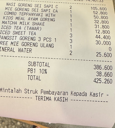 Masalahnya cuma di makanan datang lama sekali. Setiap makanan datang satu per satu dengan jarak waktu yang lama. Satu dari kami selesai makan baru pesanan lain datang satu per satu. Padahal resto dalam keadaan sepi (lunch time di bulan puasa). Kami klaim free mie goreng birthday karena salah satu dari kami ultah di minggu ini. Dan mie goreng tersebut datang saat literally kami semua selesai makan. Lebih dari 1 jam. Apa karena gratisan?