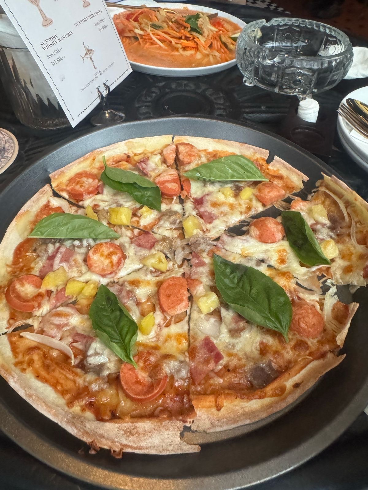 We ordered AOMâs Pizza and Som Tam cause we werenât that hungry just grabbing snacks/light meal and the size were for sharing as well.