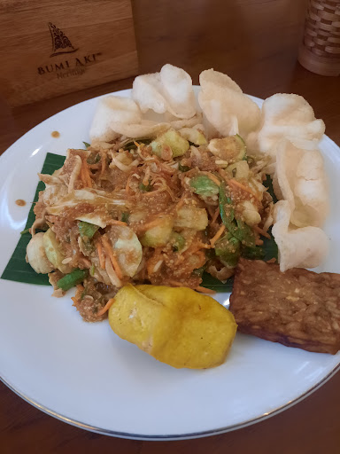 Karedok (7/10) Untuk ukuran restoran masakan Sunda, karedok versi Bumi Aki Heritage termasuk tidak autentik. Bumbunya agak melenceng dari kodratnya. Salah satu komponen adalah wortel. Jelas bukan bahan karedok.