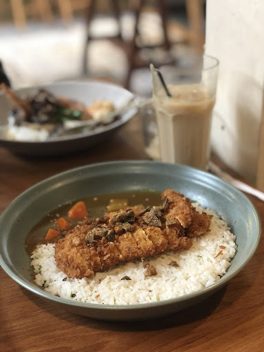 (+) Comfy place to work or just have a chit chat with others. I love the Gyumeshi menu!!!!! Its pretty good🥺 the caramelized onion that combined with the crisp mushroom was damn g00d. In love with the overall sweet-savory taste. Cant agree more! will come again and reorder that dish!🤤 But the curry comes very regular. I dont really recommend this one🙄 I love the way they serve all of their foods btw. The platting… they take it seriously and im lucky could eat well while enjoying their aesthetics dish😋 You could find mushola there.