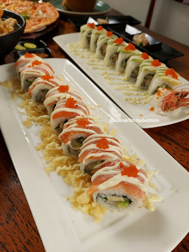 on frame : dragon roll sushi crunchy salmon mayo sushi rice chicken katsu kari salmon head miso soup pizza special garasi 81 mie kocok cuanki choco ball (meses / kacang) roti portal (baileys / cheese) coffee latte pandan coffee wintermelon cheese macchiato kopi baileys coklat jelly aren lemon blossom yakult lychee