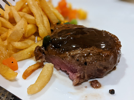 Komen objektif : Cocok bgt buat loe pade yang mau makan steak beneran (bukan daging terigu goreng) tapi harga masih manusiawi. Cocok bgt buat bawa keluarga dan temen rame2, banyak menu dan porsi jumbo. Buat aman kalo loe mau makan steak, bawa duit minimal 80 rebu (sudah minum dan pajak). Kalo niat cuman makan nasi goreng + minum teh bawa duit 50 rebu.