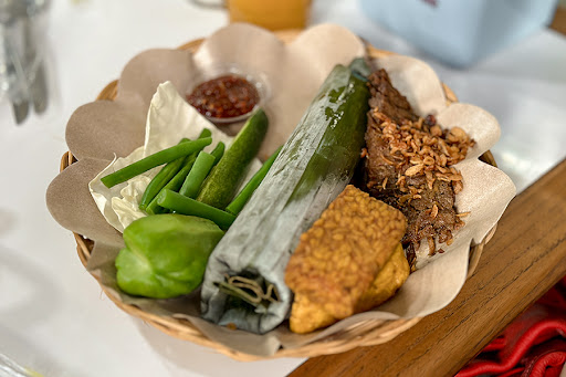 We ordered Nasi Timbel, rice wrapped in leaves and cooked to perfection with a wonderful fragrance. For the side dishes, we chose grilled chicken, fried beef empal, and tofu tempeh. The vegetables were also delightful, including green beans, cucumber, and small squash, complemented by a spicy sambal ulek that pairs perfectly with the meal.