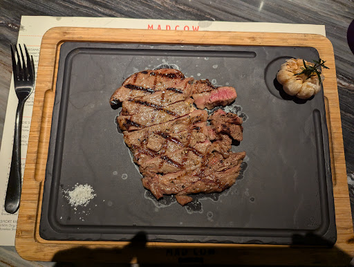Di Mad Cow, side dish dan saus dikenakan biaya terpisah dari steak.