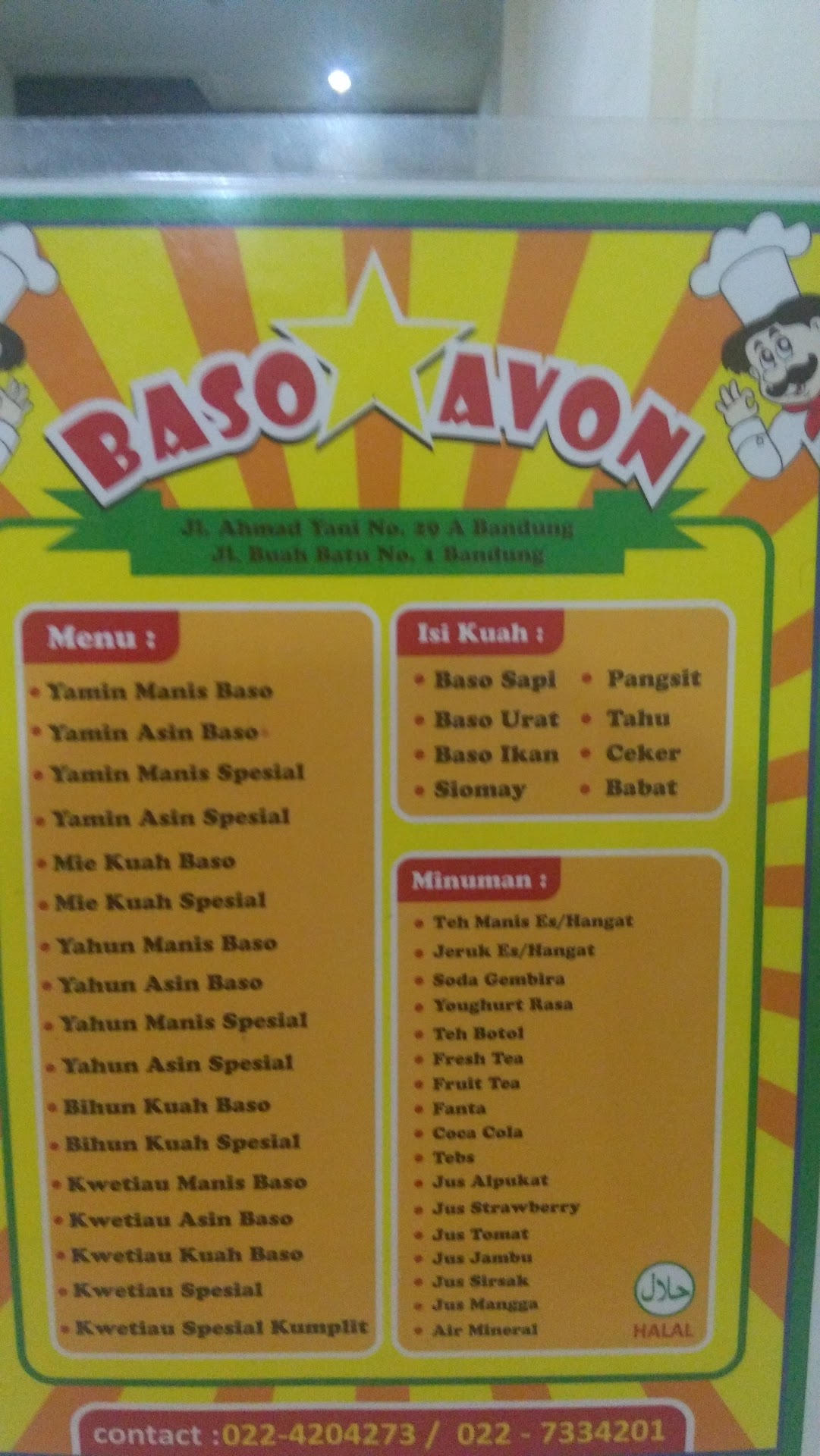 Read moreBakso Avon, keunggulannya ada pd kuahnya yang dibuat dari kaldu ayam dengan aroma ringan yang dicampur dengan bawang putih dan bawang daun. Baksonya yang diproduksi sendiri, dibentuk dengan tangan dan tanpa digiling. Menu andalan Bakso Bintang Avon adalah Yamien Manis dan Es Jeruk. Yamien-nya sendiri bisa dicampur dengan bahan-bahan seperti bakso, ceker, pangsit, siomay, dan babat, tergantung selera pengunjung. Kalo kesini, sebaiknya dalam keadaan lapar, karena utk satu porsi, isinya termasuk byk utk ukuran standar kita. Kalo cewek2 sih, biasanya kl pesen 1/2porsi 🍽 😁