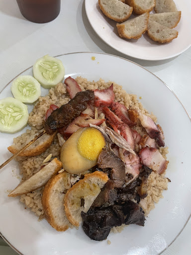 Nasi Campur Hainan (7/10) Isinya sama seperti Nasi Campur, hanya saja nasi diganti menjadi nasi hainan. Lauknya sangat beragam, ada samcan, chasiu, ayam, kuping babi, baso goreng, sate babi, telur pindang, dan irisan timun. Sebagai pelengkap, ada mangkok berisi kuah yang rasanya tidak asin. Baik nasi dan semua lauk rasanya biasa saja, malah cenderung terasa kurang bumbu. Saus yang disiram rasanya cuma manis kecap saja. Lalu satenya agak keras saat digigit. Lauk yang agak mendingan dari segi rasa hanya baso goreng. Agak disayangkan, andai kata lebih berani diperbanyak bumbunya, pasti rasanya jauh lebih baik. Porsi nasi tidak terlalu banyak, kontras dengan topping daging yang sangat melimpah.
