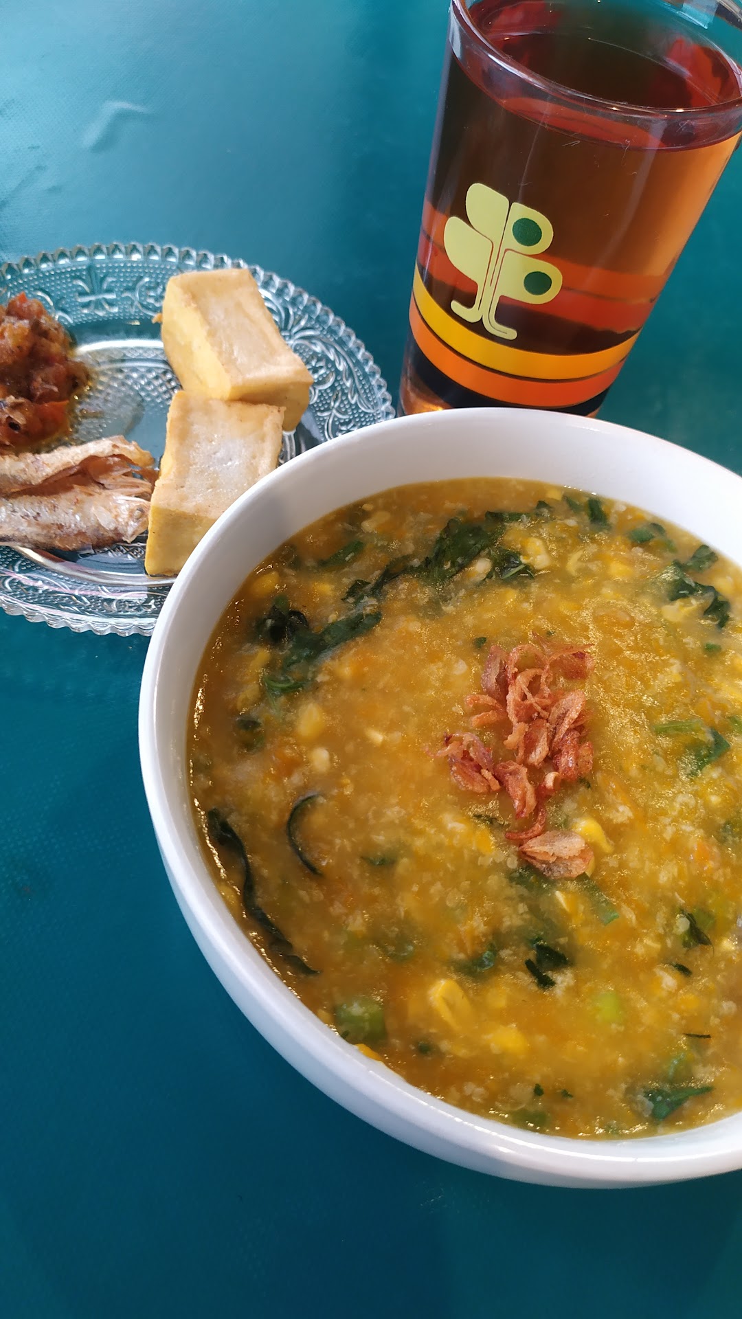 The food is great for me. I ordered bubur Manado and plain hot tea. The bubur Manado had a good taste, savoury, and a little bit sweet. A lot of vegetables were added into it, it was like a super meal in one bowl for me ๐ The condiment for completing the congee is fried tofu, salted dried fish, and sambal cakalang. The smoked fish in sambal made it more delicious.