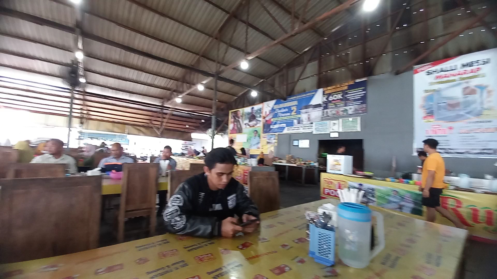 Kemarin saya makan sekitar jam 2 siang, dengan suasana mau hujan dan bisa dibilang angin sedang sepoi-sepoinya pada waktu itu, menjadikan susana makan sangat nyaman walaupun pengunjung banyak berdatangan. Gatau kalau pada waktu itu cuaca sedang teriknya, apakah dalam ruangan masi tetap sejuk? Karena atapnya hanya menggunakan atap biasa tidak dilapis lagi dengan plafon. Hal sederhana ini sebenarnya tidak mengganggu saya, karena saya cukup suka. Namun sayang bagian dinding banyak sekali dihiasi dengan poster iklan yang menurut saya mengurangi konsep kesederhanaan itu sendiri. Terlihat norak dan maksa kalau...