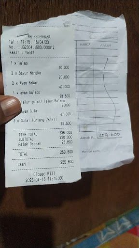 Saya rasa masakannya sekarang tdk sama dg awal2 RM Sederhana Banjarmasin dibuka atau RM Sederhana cabang lain. Yg terasa pd masakan Randang, krn itu menu favorit, dagingnya masih agak alot. Selain itu ada hal kecil, tp kalau dibiarkan akan membahayakan konsumen, yaitu lantai toilet di lantai atas tidak sama tinggi dg lantai ruang makan, walaupun perbedaanya cuma 3cm tp bagi org2 yg menginjaknya bisa cedera, krn kecenderungan org berjalan tdk melihat ke bawah berhubung menganggap elevasi lantai sama tinggi, apalagi buru2. Seharusnya itu diberi tanda berupa lis (stepnosing) yg berbeda warna sehingga org secara naluri akan menduga ada perbedaan elevasi lantai. Saya juga kebetulan membawa orang tua yg pakai kursi roda, ttp paving halamannya sdh mulai pecah2 sehingga menyulitkan kelompok difabel yg menggunakan kursi roda mengakses...