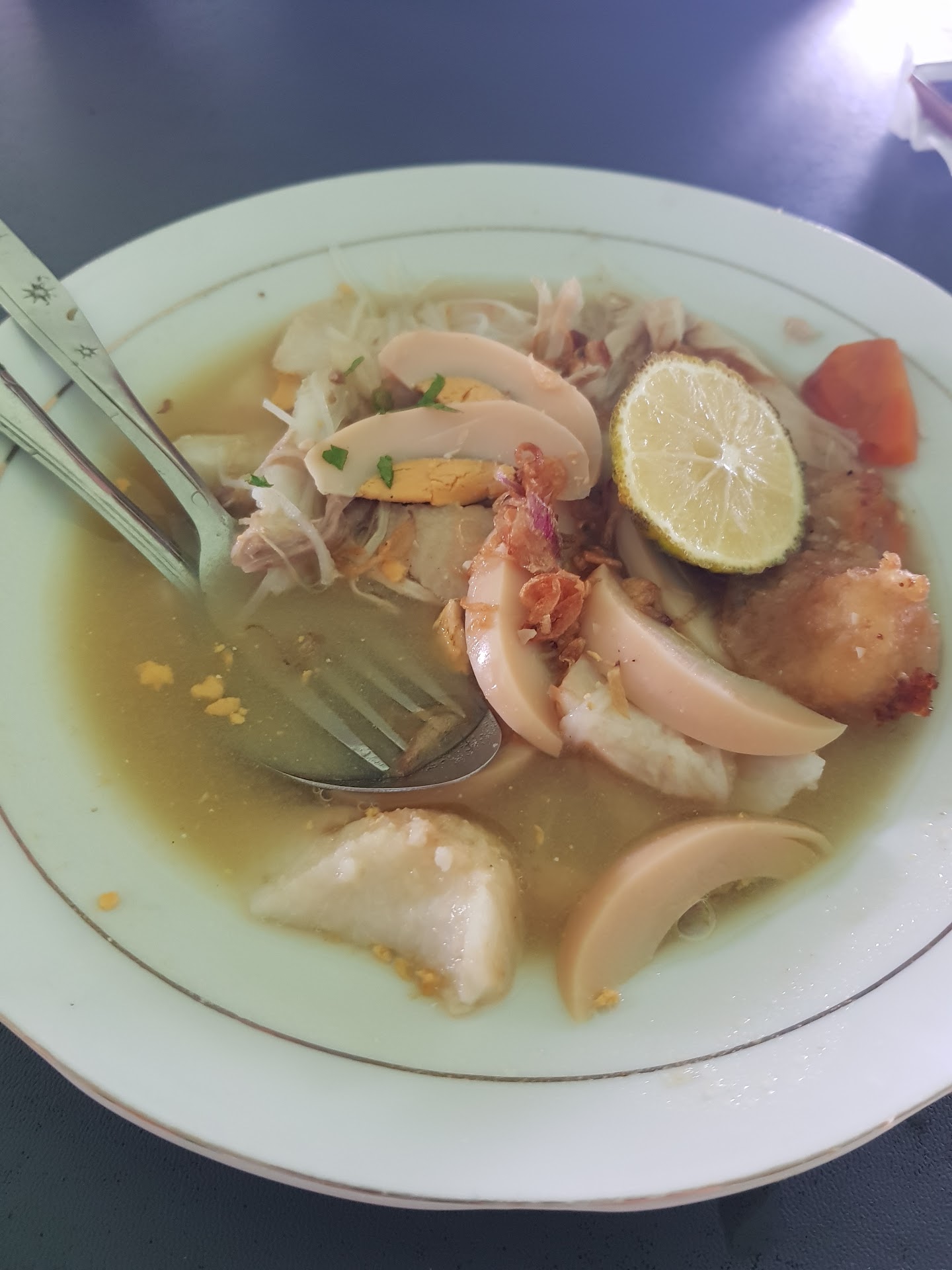If you visit this place you can order Soto Banjar (served with Lontong, kind of rice cake) or you can order nasi sop (same soup as Soto Banjar but served with rice). You can also choose the portion either full or half, with chunk of chicken or just ordinary portion. You can request based...