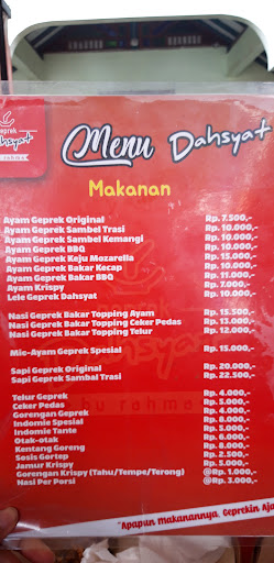 (+) Kategori lumayan+ (3.5 dari 5). Saya suka ayam gepreknya dahsyat, ini kali pertama makan yang di dkt daerah paseban (ada bbrp cabang). Biasanya saya makan yang di jl dr wahidin dkt timur-nya RS penembahan senopati. Yg saya suka dari ayam geprek dahsyat secara keseluruhan nasi nya enak, bersih, minumnya porsi gedeeee, bikin puasss....