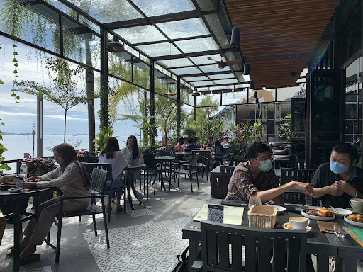 Located in Harbour Bay just along side the sea, one neighborhood with other cafes. This place serve juice, mocktail, snack, coffee, tea, and some main dishes. The place is cozy to chill during hot sunny day, can also be a place to hangout during sunset. Can have breakfast, lunch, dinner here. Went there on Saturday afternoon after a rain, sit outside so can see the boat and ferry that passing by to the harbour. Ordered blue lady mocktail, semangka rangka mixed juice, and new york cheese cake. The juice not cold enough and tase so so. While the mocktail really refreshing. The extraordinary one is the cheese cake, this is so soft and tasty while the bottom is crunchy as what a new york cheese cake should have. Two thumbs for the cheese cake. Service was good, they are kind and warm on treating customers. Price wise quite competitive compare others around this place. Parking not so difficult, only maybe during peak time it will be...