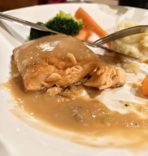 Drinks arrived quickly. Food really took a while to arrive. Salmon was really dry and overcooked. It ended up fried. Mashed potatoes was tasteless and dry, not creamy at all. Side vegetables were fresh but tasteless (do salt the water/vege). Mushroom soup was ok-ok. Staff forgot to set cutlery on table earlier and took a while.to bring up cutlery, my food had cooled down by then.