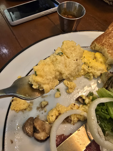 Now onto the food. The brioche bread was stale and bone-dry. The scrambled eggs… weren’t scrambled. They looked like they’d lost all will to live. I checked photos from other reviewers and had to wonder — did we get the understudy chef’s understudy?