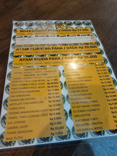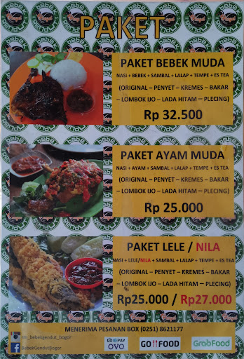 Pilihan menu utama ada bebek gendut & muda, ayam pejantan & muda, ikan lele & nila dengan pilihan masak goreng original, penyet, kremes, bakar, cabai hijau, lada hitam, plecing & bakar mentega. Sayur, lauk tambahan & pilihan minuman juga cukup beragam. Tersedia juga menu paket dengan harga lebih ekonomis. Pembayaran selain tunai, bisa juga dengan uang digital OVO atau Go-Pay.