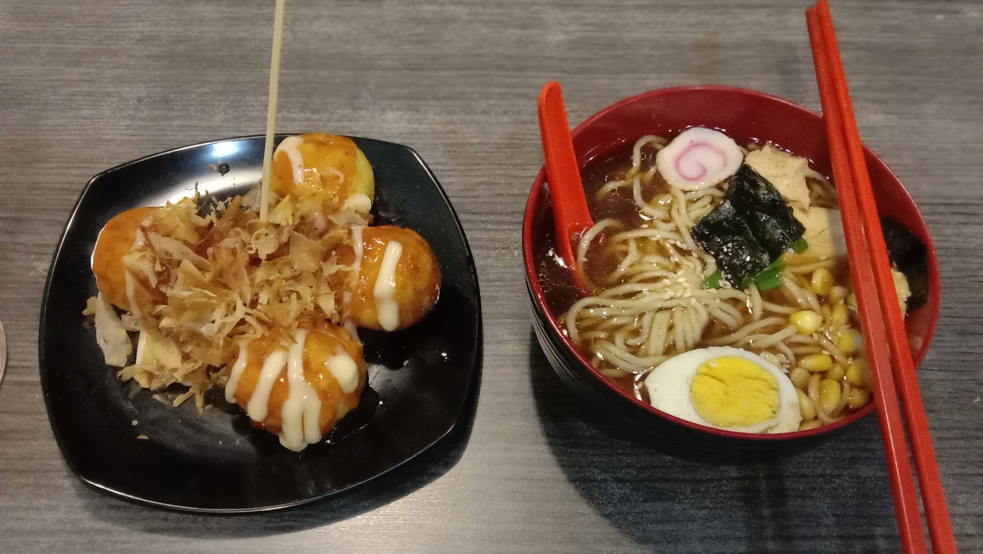 Isi paket: Takoyaki, ramen, dan Orange Juice. Takoyaki lembut, agak manis, serasa adonan pancake. Menurut saya, tektur dan rasa kurang sesuai dengan Takoyaki pada umumnya. Ramen. Hendak pesan ramen Shoyu, namun habis, jadi diganti Miso. Mie nya gembos, gak kenyal sama sekali, kayak direbus di air yang belum panas mendidih. Untuk kuahnya, karena baru pertama merasakan Miso, jadi gak tau itu Miso Ori Jepang itu seperti apa, tapi kuah Miso di Ramen ini kurang cocok dengan selera saya, alhasil saya terpaksa hanya menghabiskan Mie yang gembos tidak kenyal, dan isiannya yang gak banyak juga. Orange Juice nya, adalah Es Jeruk pada umumnya, yang menurut saya agak kemanisan dan kurang terasa Jeruknya.