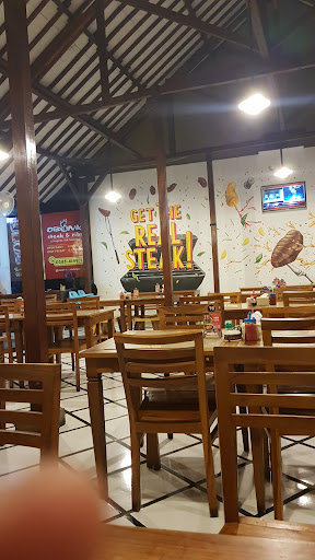 Read moreSebenarnya tempatnya asik dan nyaman di tengah kota, lahan parkir yang luas dan lokasi yang mudah di akses. Untuk pilihan ruangannya pun ada yang outdoor dan indoor. Disediakan juga ruangan tertutup ber-AC. Bentuk bangunannya seperti pendopo, jadi untuk penerangan harus pakai lampu. Waktu saya kesana sekitar pukul 3 sore juga sudah lumayan gelap tanpa adanya lampu. Mengenai pelayanannya sangat memuaskan, pelayannya ramah dan cekatan. Penyajian makanannya juga termasuknya cepat. Untuk makanannya sendiri, menurutku standar sama dengan warung steak yang lain. Mungkin karena pas itu saya pesan makanan yang promo, jadi tidak bisa berekspektasi lebih. Sayangnya waktu itu steak yang saya pesan terlalu asin, jadi harus ditambah saus yang cukup banyak buat menetralkan asinnya. Brown sauce nya juga biasa saja.