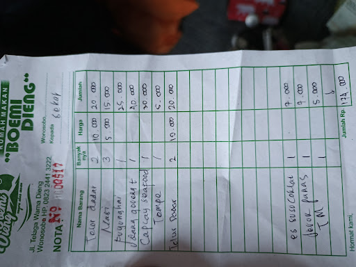 Read moreKami rombongan 2 mobil 15orang. Setelah berkunjung di objek wisata Candi Arjuna. Cari2 tempat Makan yg rekomended bagi kami. Akhirnya ketemu setelah browsing dari googlemap. Rumah Makan Boemi Dieng. Baca ulasan2 nya yg lumayan bagus. Akhirnya kami coba cari info lebih dalam. Salah satu koordinator rombongan masuk. Dan beberapa saat kasih info. Rumah makan siap menampung. Karena kami tidak reservasi. Kami disarankan Menu prasmanan yg sudah tersedia dengan menu paket @Rp.25.000 ( Teh ;Nasi putih ; sayur asam ; oseng2 ; ayam goreng + sambal lalapan; kerupuk ; buah ) dengan harga menu paket segitu bagu kami cukup murah. Enak. Sayur asemnya segerrr mirip sayur asem jawa barat. Dengan kuah yg condong ke asem memang 😍 sambelnya enak. Ayam gorengnya juga empuk dan merasuk bumbunya. Pelayanannya juga lumayan cepat. Dari Mulai kami order hingga di sajikan pesanan kami sekitar 30 mnt. Karena memang pengunjung disitu. Lumayan cukup rame dan rombongan mulai dari mobil pribadi ; haiaze ; elf sampe bus kecil. Cocok untuk rombongan tempat nya sangat luas. Sayangnya.. Air untuk toilet dan cuci tangan kadang mati dan hrs menunggu beberapa saat. Kalo kebersihan. Lumayan sih. Karena begitu banyaknya pengunjung. Dan dengan karakter mereka yg bermacam2 ada yg sadar kebersihan dan ada yg seenaknya.. 😁😁...