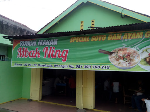 Jika Anda penyuka ayam goreng, tempat ini bisa menjadi salah satu pilihan. Tempat ini merupakan warung makan ayam goreng yang jika dirunut termasuk warung ayam goreng 'pendahulu'. Ayam kampung goreng dengan sambal bawang merupakan menu favorit. Di samping itu juga tersedia soto ayam. Dalam perkembangannya, soto ayam yang ditawarkan termasuk soto kering. Soto kering merupakan sajian nasi soto tanpa kuah. Tempatnya cukup mudah ditemukan. Jika dari arah kota Wonogìr, kita bisa brkendara menuju selatan. Sebelum masuk kawasan bendungan serbaguna Gajah Mungkur, ada simpang tiga Monumen Kalpataru. Arah ke kiri kurang lebih 50 meter adalah tempat Rumah Makan Mbak Ning. Jika berkendara dari arah selatan, tempat Objek Wisata Waduk Gajah Mungkur, setelah sampai Monumen Kalpataru belok ke kanan. Arah ke kanan kurang lebih 50 meter kita sudah sampai di lokasi...