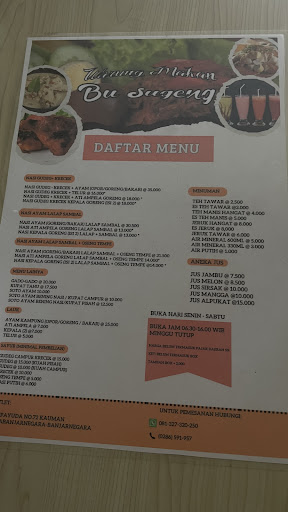 Read moreBila datang ke alun-alun Banjarnegara, jangan lupa mampir ke warung makan bu Sugeng. Warung ini berada di komplek perumahan Kauman Masjid Agung An-Nur. Disini menyediakan gudeg spesial dengan berbagai lauk, soto bening, gado-gado, ayam bakar, ayam goreng ,berbagai kudapan, dan berbagai minuman segar. Tempat strategis, nyaman, bersih dan pelayanannya sangat ramah. Sekitar beberapa tahun lalu, di warung makan bu Sugeng menyediakan menu roti maryam baik dimasak matang maupun maryam frozen. Anak saya suka sekali makan roti maryam karena beli disini. Beberapa hari yg lalu saya mampir kesana rupanya sudah tidak lagi menyediakan...