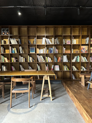 The interior is simply amazing, with books, abstract paint, the cement, wood and black metal painted around is feels modern Japanese kinda style. The dynamic of flooring level also great!
