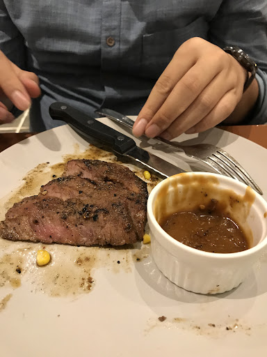 The food is good. I ordered medium-well USDA Prime Sirloin/Aus Wagyu MB 6+ (sauteed corn included), with mashed potato as a side (you have to order separately), and black pepper sauce. The steak came out well done but it was still juicy, a bit chewy not tender, flavorful, perfectly seasoned. The sauteed corn was a bit too buttery, while the mashed potato was a bit bland. The star of the meal was the black pepper sauce. It was thick, not too spicy but has this peppery kick that compliments the steak really well. Seems like they crushed their own pepper because I could still find whole peppercorn but it gives it a nice authentic taste.